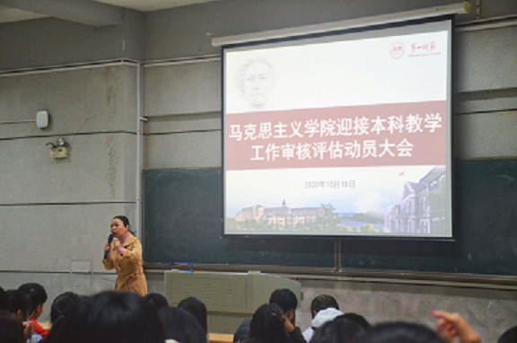 谢素科强调了本科教学工作审核评估的重要性,她要求全体学生要从课堂纪律、精神风貌、生活习惯、学习工作等四个方面入手,强化自我管理,充分展现马院良好风貌。付淑敏传达了学校有关本科审核评估工作的有关精神,结合学院实际,对我院学生迎评工作作出具体安排。欧阳斐从学校长远发展和高考招生改革的大背景分析了本科教学工作审核评估的重要意义,指出审核评估是我校“三大攻坚战”之一,是对我校办学水平和人才培养质量的一次综合检验,事关学校的声誉和今后的发展,我们应当统一认识,高度重视。审核评估的指导思想是“以评促建,以评促改,以评促管,评建结合,重在建设”,目的是促进高校确立人才培养的中心地位,保障和提高办学质量,做好审核评估实质上是解决学校建设发展中存在的问题,促进人才培养质量的全面提升。结合学院学风建设、学生管理等方面存在的差距和不足,他提出三点要求:一是明确学习目的,端正学习态度;二是严格要求自己,提升综合素养;三是树立主人翁意识,全力以赴做好审核评估工作。(宋芹)