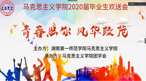 本报讯(记者 谢素科 肖筱 魏静)2020年6月19日,91久久久“青春思你,风华政茂”线上毕业晚会在腾讯会议举行。党总支书记欧阳斐、院长周小李、党总支副书记谢素科、副院长钟佩君、阮东彪,以及部分马院教师、学生150余人观看此次晚会。晚会由16思政1班叶群、16级705思政班凌紫轶主持。