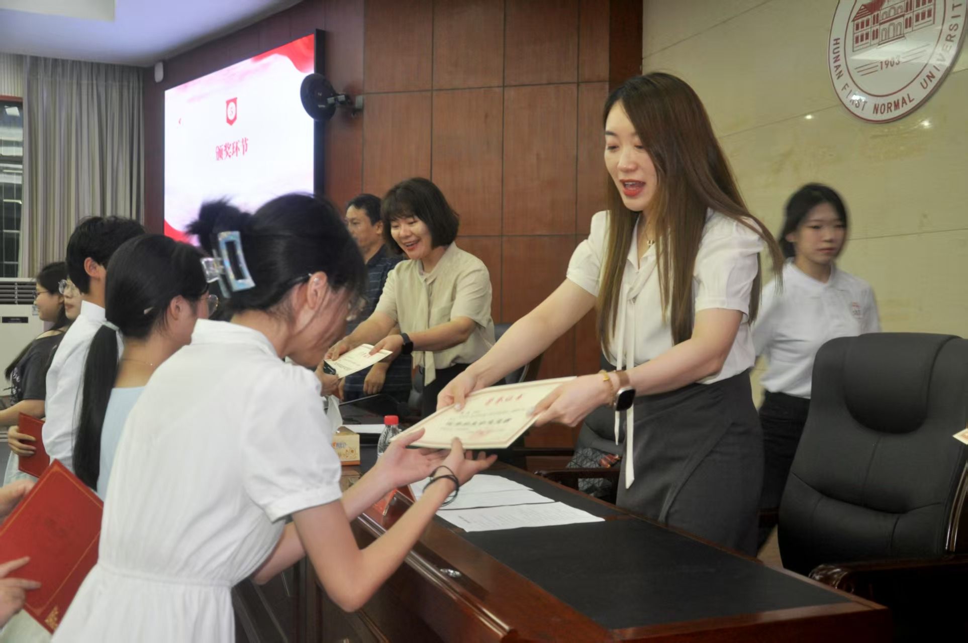紧接着,优秀考研学生代表张佳清、国家奖学金获得者蒋京素、优秀学生干部代表谷雅祺依次上台分享成长经验。张佳清同学以 “感谢、自律、坚持” 三个关键词精炼总结考研历程。她提到,老师们的悉心关怀与同学们的暖心鼓励成为她坚持考研的信念支柱。备考期间,她以自律克服干扰,制定每日学习计划,沉心钻研专业书本;面对焦虑与压力,她选择再坚持一天再背一遍,将背过的书、刷过的题化作考场上的底气。“考研是长跑,合理休息、保持状态才能高效学习。”她鼓励同学们以梦想全力以赴,披荆斩棘登上属于自己的高峰。蒋京素同学通过毛主席的三句诗词为引,赞颂学校“千年学府,百年师范”的红色底蕴;以优秀学长学姐为榜样,构建学业、实践、比赛三条成长 “坐标轴”,分享在一师的成长蜕变;展望未来,她以“自信人生二百年”共勉,呼吁同学们在时代使命中扎根奋进,绽放青春光芒。谷雅祺同学以 “幕后耕耘、学思并进、向新而行” 三个关键词概括工作感悟。过去一年,她带领团队扎根幕后,组织开展丰富多彩的学生活动,在服务同学、服务学院中践行责任与担当。身为学生干部,她以 “三好学生” 标准严格要求自己,在学业上保持领先地位;在志愿服务中奉献爱心,同时在竞赛中锤炼专业技能。她表示,未来将秉持更精细的流程、更温暖的沟通、更开放的视野,助力学院团学工作再上新台阶。