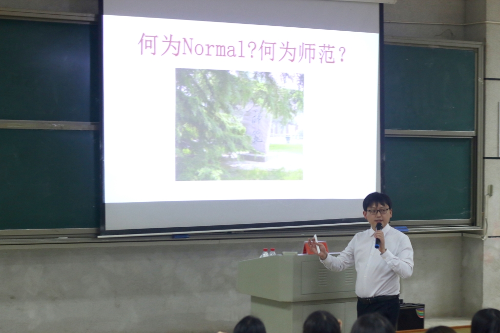 首先,张波男老师跟同学们分享了自己的成长感悟。张老师向同学们提出问题——“何为Normal?何为师范”,引发同学们的激烈讨论和思考,并以“师范就是模范”为切入点铺展开来。张老师分别从“回望”“立德”“立功”“立言”四个方面为同学们分享了自身成长经历、教育初心萌发、教学生涯经验以及自身德育观点。随后,姜小明校长给同学们带来了精彩一课,以现场展示演绎了一堂好课的四个标准,那就是“趣味引入”“知识悟人”“情感动人”“高度启人”,同时深刻阐述了“以人为本”“问题意识”“立德树人”的教学观点。最后,两位老师分别给同学们送上了宝贵建议和殷切期望。