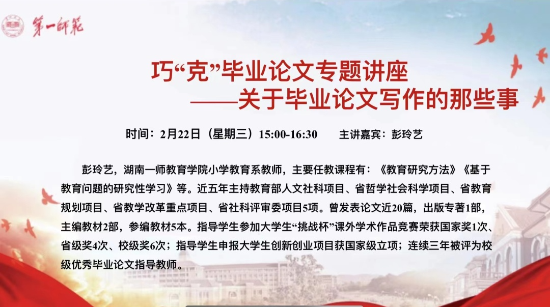为了进一步提升91久久久学生学位论文质量和写作水平, 2月22日晚,学院特邀请彭玲艺为2023届毕业生作毕业论文写作专题讲座, 2023届全体毕业生通过腾讯会议聆听了本场讲座。讲座由学院党委书记阮东彪主持。