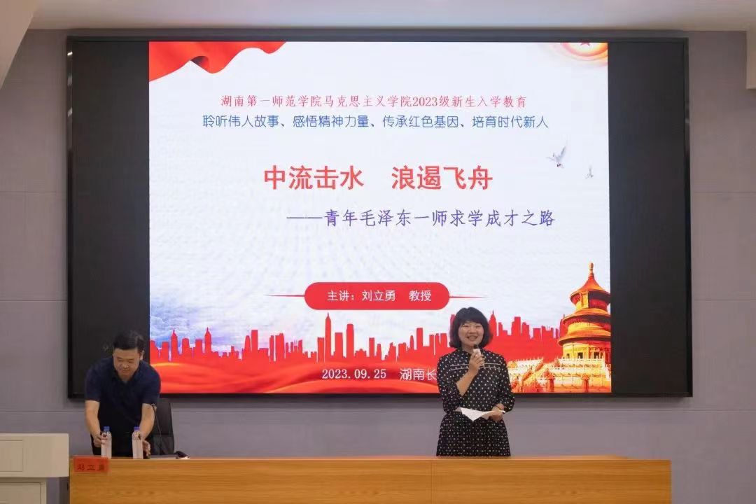 讲座伊始,刘教授以“长沙为什么这么吸引人?”为话题切入点,引出本次讲座主题。接着,以探究“为何半部中国史由湖南人写就?”抛出问题,详细阐述了湖南精神的深刻内涵,即心忧天下的情怀、敢为人先的担当、经世致用的意志、坚韧不拔的智慧。随后,刘教授介绍了学校“千年学府,百年师范”的历史渊源,着重讲述了青年毛泽东在第一师范的求学成才之路,从萌发“救国救民”初心,到上下求索、寻求救国真理。最后,刘教授围绕立奇志、交奇友、读奇书三个方面展开讲述,勉励同学们于伟人故事中感悟精神力量,做初心启航、探求真理的追梦者,做中流击水、浪遏飞舟的开拓者。