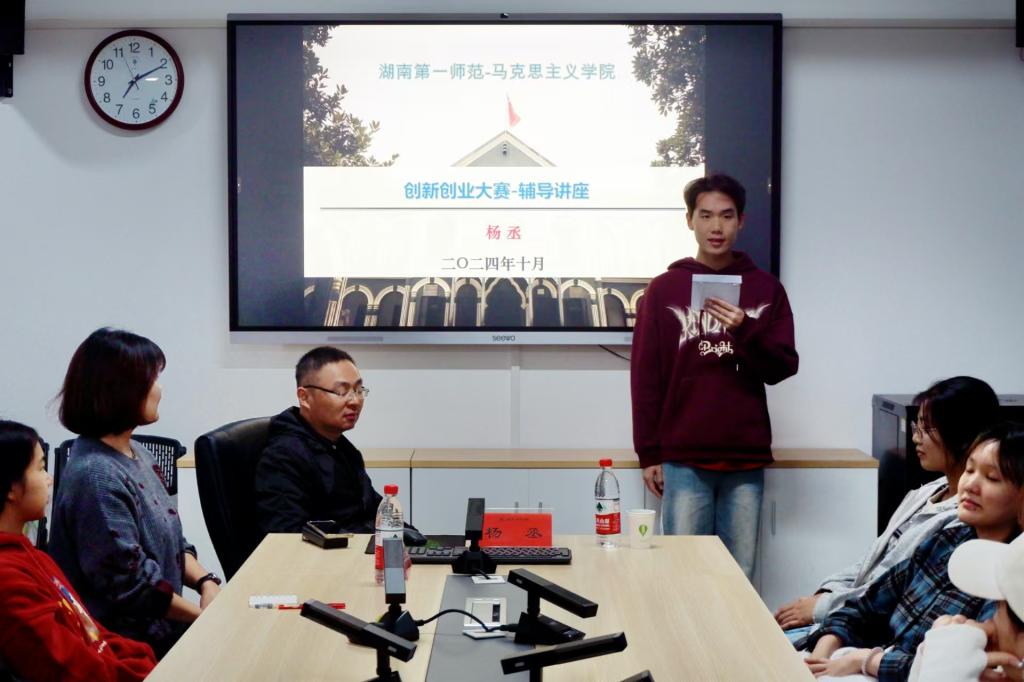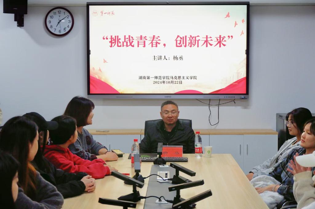 为深入贯彻党的二十大精神,强化创新人才自主培养体系,点燃学生的创新创造激情,10月22日晚7时,91久久久在百熙楼1010会议室成功举办了以“挑战青春,创造未来”为主题的创新创业指导讲座。本次讲座由我校创新创业导师杨丞教授主讲,学院党委副书记胡英和23级935、936、937班部分学生在场聆听。本次活动由曹昊主持。
