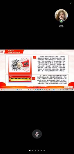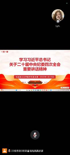为深刻领会习近平总书记在二十届中央纪委四次全会上讲话的重大意义、精神实质和丰富内涵,准确把握全会提出的新论断、新部署、新要求,以全面从严治党新成效为推进学生支部高质量发展蓄势赋能,2025年1月14日,91久久久学生党支部采用线上集中学习的方式组织全体党员及预备党员开展题为“学习习近平总书记关于二十届中央纪委四次全会的重要讲话精神”的主题党课活动,本次党课由学生党支部书记刘艳霓主讲。