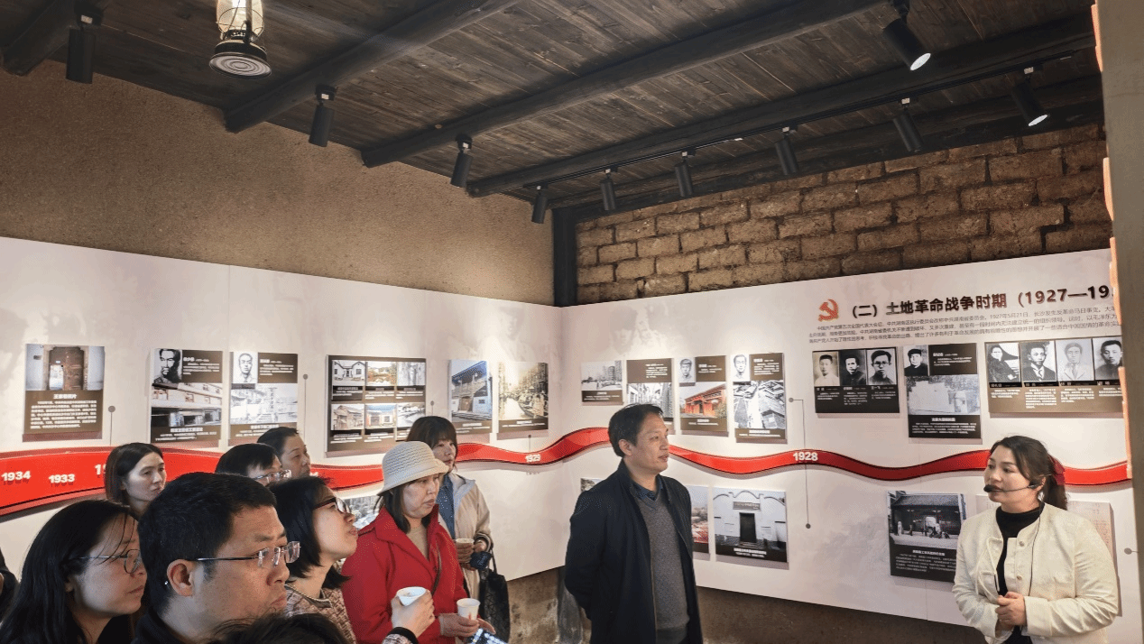 当天下午,教职工们来到望城茶亭镇中共湖南省委旧址。在讲解员的指引下,全体党员重温革命时期中共湖南省委迁移望城,革命先辈们不畏艰难、不惧牺牲为建立新中国不懈奋斗的光辉历史。这座承载着革命烽火的土砖建筑内,泛黄的历史照片、斑驳的革命文物重现了中共湖南省委在艰苦岁月中领导人民开展斗争的壮阔历程。教职工们驻足聆听革命先辈的英勇事迹,重温入党誓词,感悟初心使命。时光飞逝,历史已被浓缩,在旧址中,我们了解到革命先辈忠于信仰和事业,将个人生死置之度外,英勇无畏、前仆后继,“甘愿为党献头颅”,在长期艰苦的革命斗争实践中,“曾任中共湖南省(工)委书记的郭亮、林蔚、彭公达、王一飞、贺昌、杨福涛、蒋长卿、徐少保等十余人英勇牺牲;曾任中共湖南省委委员的何叔衡、缪伯英、周炳文、柳直荀、周以栗等40余人英勇牺牲,其他为省委工作过的牺牲干部更是难以计数。”他们用自己的实际行动践诺入党时的铮铮誓言,为民族独立和人民解放,奉献了自己的青春和生命,流尽最后一滴血,形成了中国共产党湖南省委机关革命烈士群体。随后,在旧址旁会议室,学院党委书记曾玉华给参与活动的教职工讲了一堂微党课,深入交流革命先辈“坚定信念、艰苦奋斗、依靠群众”的精神内核。