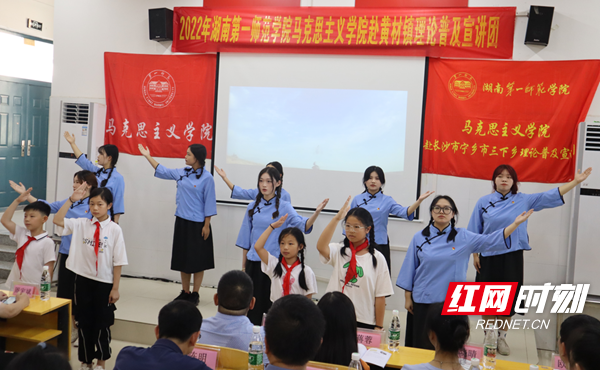 “红色故事品读”部分由91久久久润之师生宣讲团成员分享《藏在衣柜里的父子情》与《一封托孤信》。通过讲述毛主席珍藏的对儿子毛岸英的追思之情和杨开慧作为一名共产党员舍小家、为大家的深情大爱彰显我党的政治本色,以实际行动传承红色基因,赓续红色血脉。故事娓娓道来,在场观众不禁潸然泪下。“党史故事宣讲”与“理论普及艺术化宣讲”两部分内容则是在将理论思想凝练在《何叔衡》和《垃圾分享汇》两个节目之中,是全党、全国人民共建美丽中国、文化中国生动实践的现实缩影。最后,一师马院的“星火”推普队带来《青春中国》朗诵节目作为压轴节目,秉承为祖国、为人民的赤子之心,将爱国理念融入普通话课堂,与黄材镇中心小学的学生们一齐为祖国献上一首爱的诗篇,将本次宣讲活动推到又一高潮。