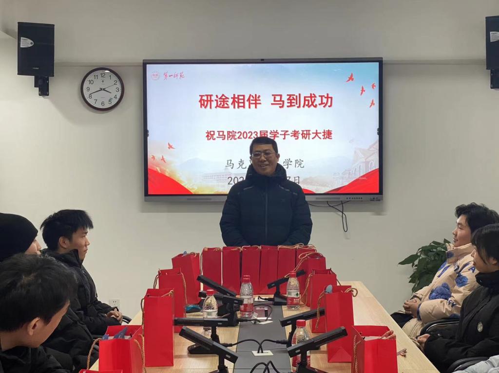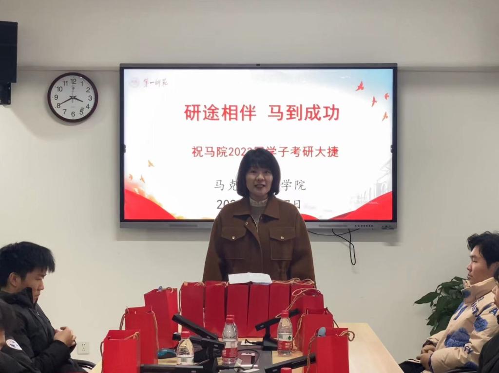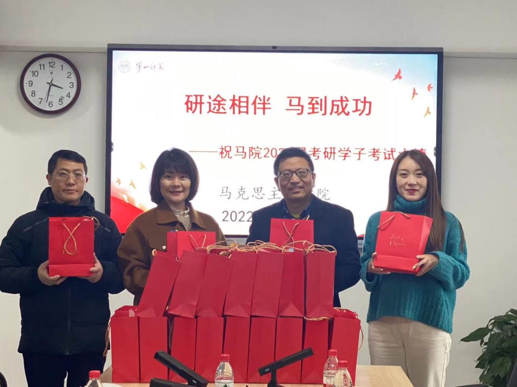 阮东彪书记结合自己多年的考研指导经验,给同学们分享专业学习和应试技巧方面的建议。并鼓励同学们持之以恒,坚定考研目的、把握考研节奏、保持良好心态,时刻做到心中有数,争取在考试中发挥出应有的水平。胡英副书记亲切勉励在场的同学,她说能坚持到现在的每一位同学都很了不起,在最后的冲刺阶段希望同学们做到:一是学习上稳扎稳打,保持好状态;二是生活上合理作息,保重好身体;三是心态上适当调节,保证好心情。最后预祝同学们考试大捷。王竹苗副院长结合学科特点,和同学们分析当前考研冲刺阶段的复习思路,并鼓励同学们坚定考研信心,在备考过程中遇到问题要多思、多问、多总结。刘艳霓老师也为同学们送上了祝福,考研的路并非轻而易举,需要有明确的目标,具备挑战困难的勇气、艰苦奋斗的毅力、耐住寂寞的定力和永不放弃的决心,这样才可能达到成功的彼岸。她表示学院领导和老师都十分关心同学们备考期间的学习和生活情况,也一定会提供力所能及的支持和帮助,学院就是同学们的坚强后盾。随后,老师们将精心准备的“考研暖心礼包”一一派送到同学们手中,鼓励同学们在最后冲刺阶段,科学复习,提高效率,劳逸结合,加强锻炼,保持良好的迎考心态。
