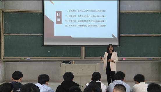 在课堂展示环节,谭彩霞老师以“从归根结底的两个‘行’读懂马克思主义中国化时代化”为主题,结合二十大报告内容,从“历史之问”“现实之惑”“探索之路”“真理之光”等四个方面展开教学,引导学生深入理解中国人选择马克思主义,推动马克主义中国化时代化的历史逻辑与理论逻辑,并从“行”在有理、“行”在有效、“行”在有力三个方面解答了“中国化时代化的马克思主义行在哪里”的问题。谭彩霞老师的讲课条理清晰、逻辑严密、层层递进,问题的设置、视频的插播有机搭配,恰到好处,课堂互动频繁,氛围浓郁。