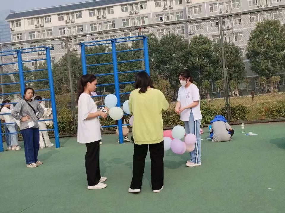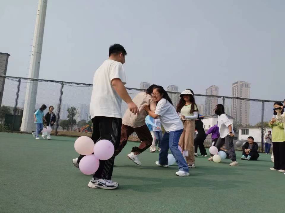 最后一项比赛项目为“踩气球”,比赛规则为每组分别派出一位选手,在其腿部捆绑一个气球,参赛者需在保证自己的气球不炸裂的情况下,踩爆其他小组的气球,气球爆炸则选手淘汰。一时间场面变得激烈起来,场上的同学们你踩我躲、你追我赶、互相攻躲,现场热闹不已。
