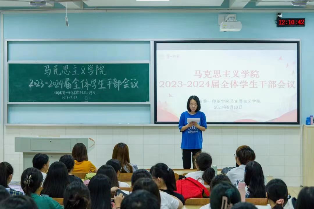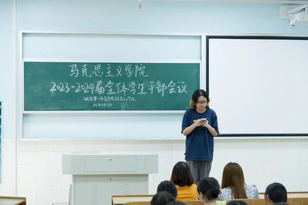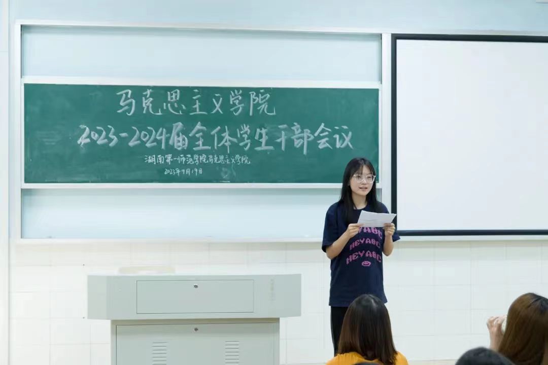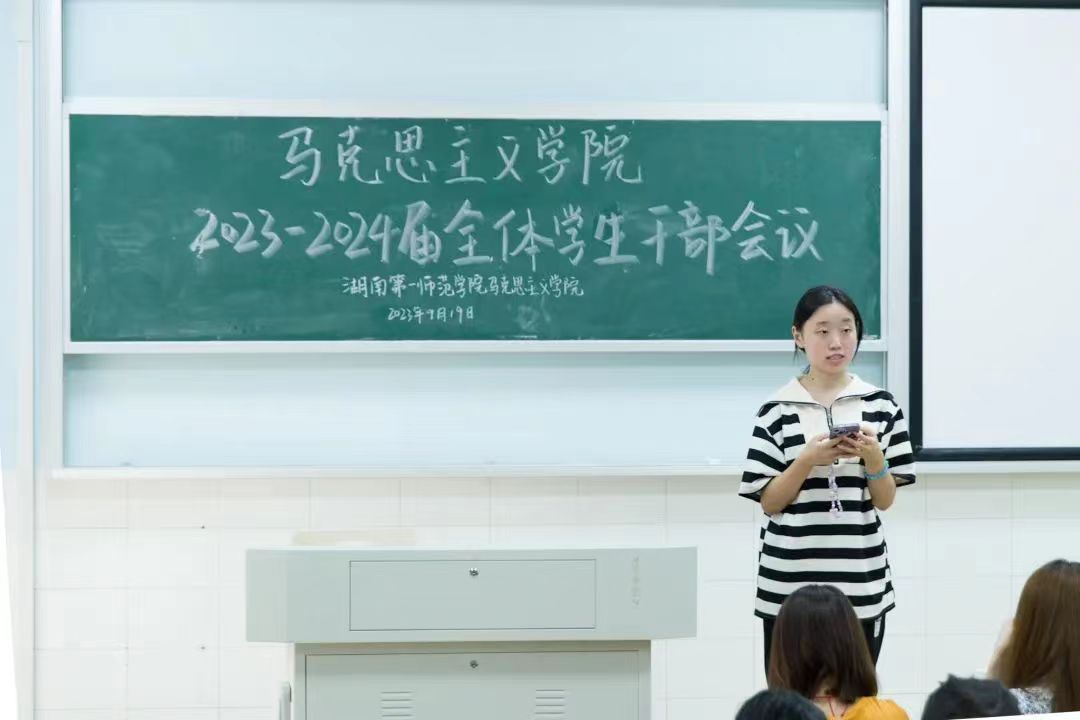 最后,分团委书记刘艳霓针对各部门上学年工作情况,对2023-2024届团学会干部第一次例会进行总结分析,对一些部门的工作提出改进意见,并对全体学生干部提出四点要求:一是培根铸魂,切实增强工作的思想性,将学生工作与思政专业特色紧密结合,开展活动的同时提升专业素质和思想意识;二是未雨绸缪,切实增强工作的前瞻性,做到提前做计划、进程按部署、事后多总结;三是强化联动,切实增强工作的针对性,尽可能多部门联动开展活动,提高工作效率,增强工作效果;四是攻坚克难,切实增强工作的有效性,要学会处理好重点工作和日常工作之间的关系,厘清思路、合理安排、有重点、多手抓。