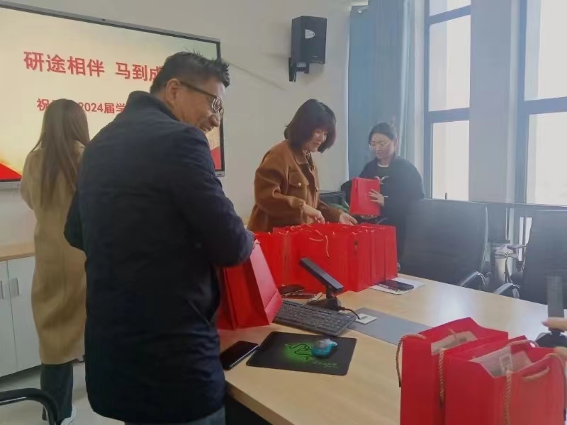 会议伊始,院党委书记阮东彪向考研学子表达了深切慰问。他亲切询问各位考研学子的备考计划、是否与目标院校的学长学姐取得联系以及作息情况情况等。接着,副院长王竹苗针对临考常见问题与学子们交流经验。他肯定了大家持之以恒的努力,帮助大家树立信心,并指出,要“从战略上藐视敌人”,同时也要“从战术上重视敌人”。他强调,在最后的阶段,应该查漏补缺,计时且规范地进行模拟答题,争取在考场上达到最佳效果。紧接着,胡慧娥副院长再次提醒考研学子“保重身体、放平心态也是笑傲考场的关键”,只有以最好的状态迎接战场,才能顺遂无虞,皆得所愿。随后,院党委副书记胡英为大家送上美好祝福,愿大家保持好心情,保重好身体,保证好状态,在考场上文思如泉涌,下笔有神助,考出人生好成绩。最后,老师们亲手将象征着关怀与重望的祝福礼包送给在座的每一个同学。