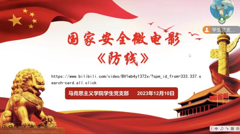 为深入贯彻落实党的二十大精神,坚定不移贯彻总体国家安全观,全面加强国家安全教育,增强国家安全意识和素养,12月10日,我院学生党支部组织全体学生党员及预备党员开展国家安全微电影《防线》主题观影活动。