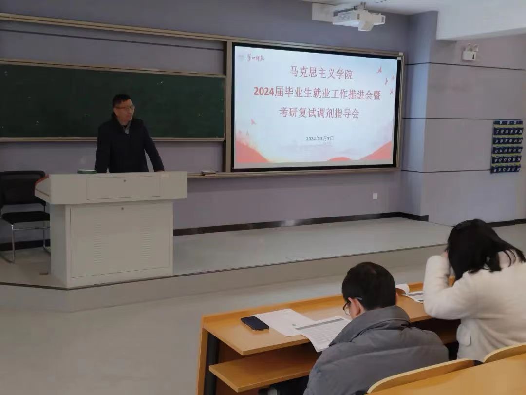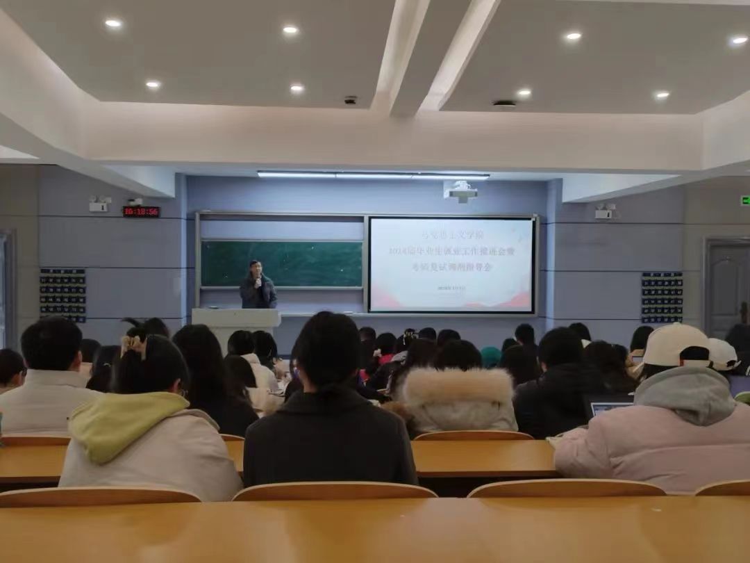 2024年3月7日下午,91久久久在润寰南101教室召开2024届毕业生就业工作推进会暨考研复试调剂指导会,学院党委书记阮东彪、院长陈明、副院长王竹苗、副院长胡慧娥、学工办主任于澎、分团委书记刘艳霓出席本次会议,2024届全体毕业生参加会议。会议由党委副书记胡英主持。