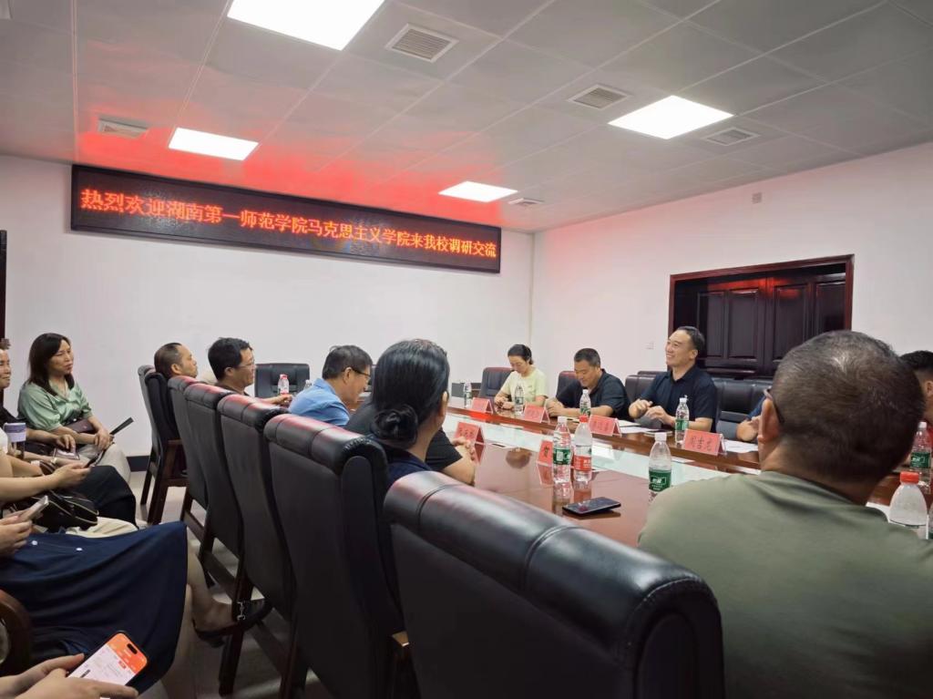 为进一步拓展我院思政专业毕业生见习实习和就业的门路,6月22日,我院党委书记阮东彪带队到安化一中调研交流,了解该校对教师的需求情况。调研交流会在安化一中图书馆二楼会议室举行,会议由安化一中学生处副主任程文倡主持。我院副院长王竹苗、教授代表贺汉魂等陪同调研。安化一中党委副书记副校长李远喜、学生处主任周吉龙、文武庙中心主任何建勋、学生处副主任程文倡、团委副书记刘林艳和欧铭聪、侯文静等教师出席。