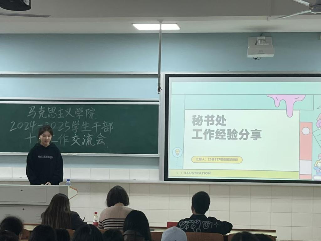 接着,学生干部们就工作中遇到的常见问题展开交流讨论。主席团实习干事曹义文作为新生代表交流了参与活动组织的感想和收获,宣传部网信中心、文体部、宿管部、学习部负责人分别介绍了部门近期的重点工作及工作初步设想。
