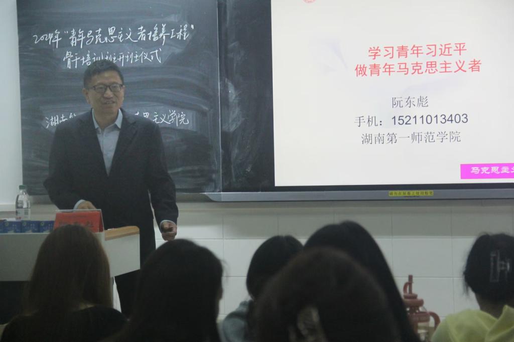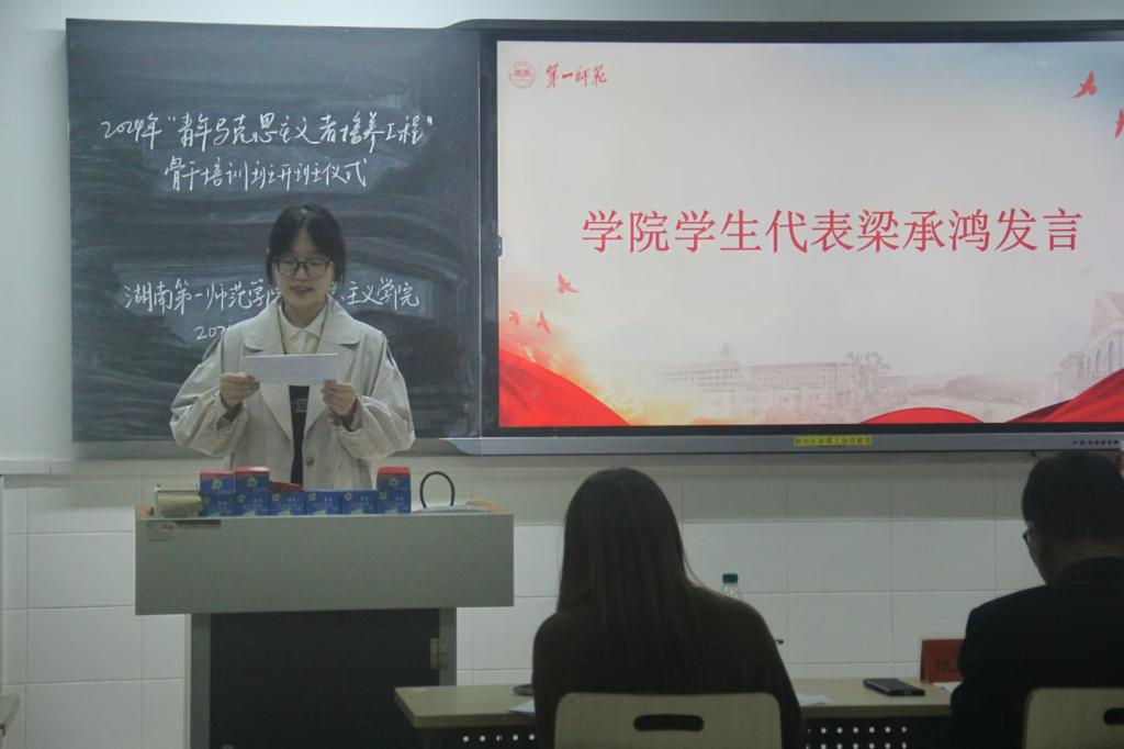 在雄浑激昂的国歌声中,开班仪式正式启动。院党委书记阮东彪、分团委书记刘艳霓以及党务办负责人梁承鸿依次致辞。院党委书记阮东彪从青马工程的重要意义、珍惜学习机遇以及坚持理论与实际相结合这三个维度展开论述,期望学员们经过青马工程的理论研习与实践锻炼,成长为有理想、有担当、有品质、有修养的青年马克思主义者。