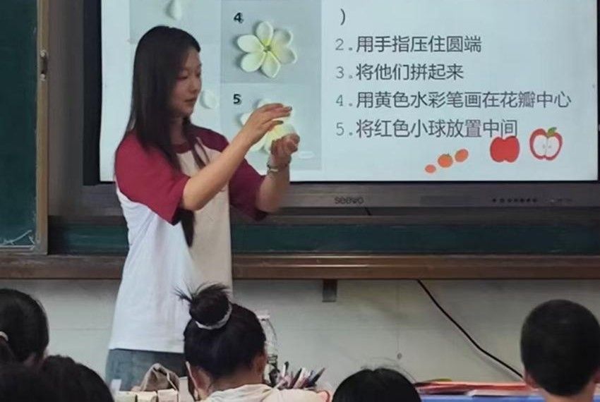 当我第一次让孩子们画画时,他们的美术作品都完成的十分出色,那一瞬间的自豪感油然而生。乡村的孩子们或许缺少教育资源,但如果给他们一个展示自我的平台,他们的表现也十分出彩。在最后一堂美术课我让孩子们以“感恩”为主题自由发挥,我当时静静地站在讲台上,看着孩子们在略显陈旧的课桌上,在蝉鸣不止的夏天,他们拿着小小的画笔,在白纸上尽情得描绘着属于他们五彩斑斓的内心世界。最后孩子们的美术作品也让我十分感动,有的孩子送给自己的父母,有的孩子送给自己的好朋友,还有很多孩子送给四位支教老师,让我记忆深刻的是有一个小女孩在她的画上写上这样一段话:“老师,你就像一道光来到了我的生活,和你在一起的每一天每一分钟,我都很开心。”我想这就是教育的意义,一场双向奔赴的爱,一场特别的相遇,既照亮了学生也温暖了支教老师。