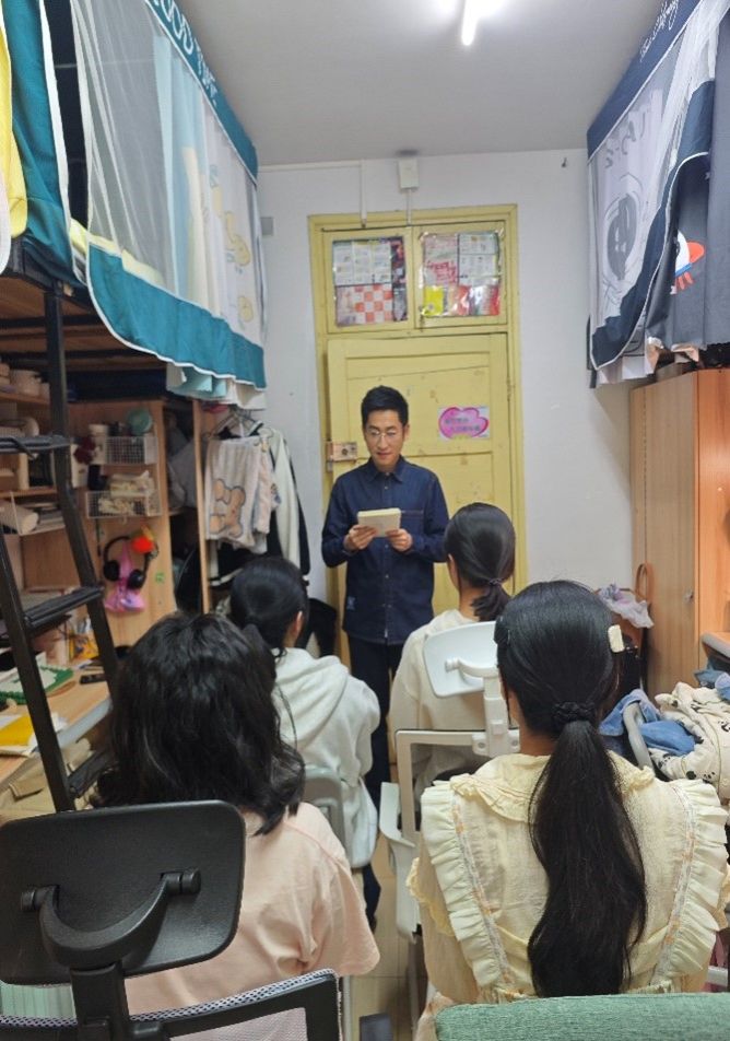 于澎老师全程参与活动并给予指导。他在现场总结讲话:"心理健康是学生全面发展的基石。这种深入宿舍的宣讲形式实现了'润物细无声'的教育效果,让同学们在生活场景中掌握自我调节技能。"结合多年工作经验,他鼓励同学们主动关注心理健康,善用学校资源:"无论天气阴晴,希望每位同学都能保持内心阳光,遇到困难及时寻求专业帮助,共同营造温暖向上的成长环境。"